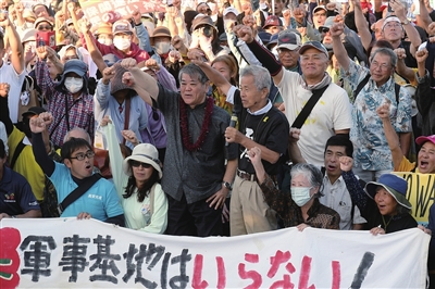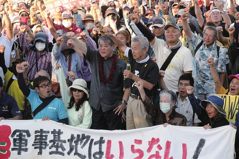 11月23日,在日本冲绳县,民众在集会上高呼口号。