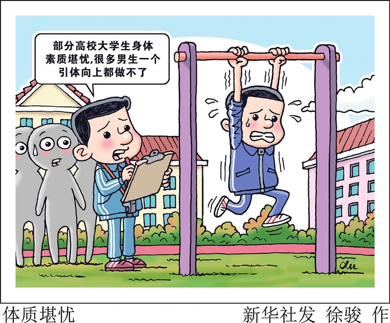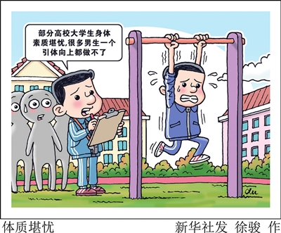 “新华视点”记者近日走进一些高校发现,部分学生身体素质堪忧。很多男生做引体向上非常吃力,立定跳远跳不远,不少学生短跑爆发力不足,存在“长跑恐惧”。