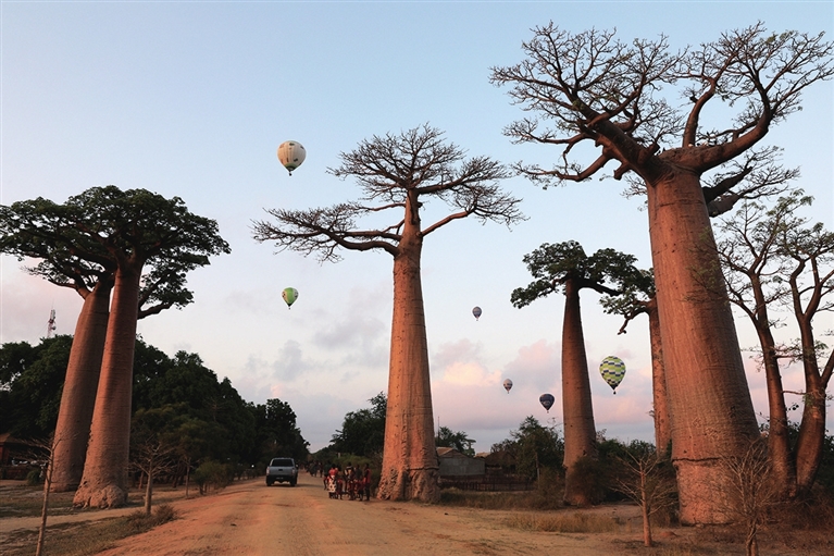 11月25日,热气球在马达加斯加穆龙达瓦猴面包树大道升空。