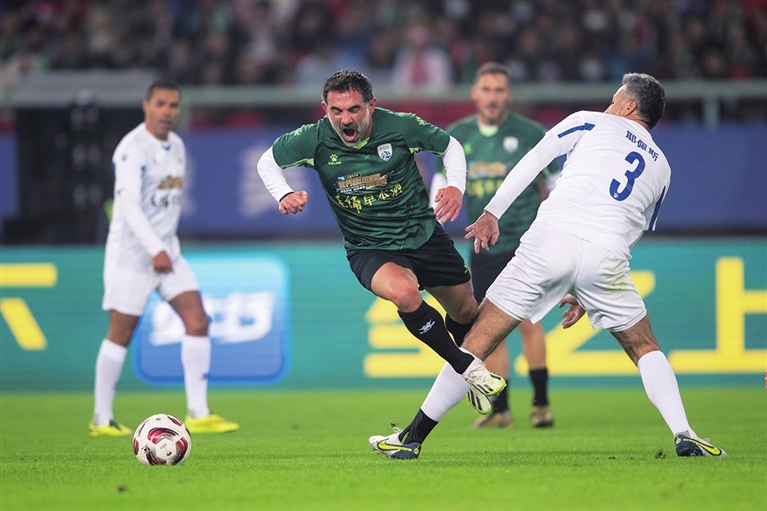 11月26日,欧洲明星队球员卡拉贡尼斯(左)在比赛中与美洲明星队球员耶佩斯拼抢。当日,2023世界超级球星足球赛在武汉体育中心举行。欧洲明星队和美洲明星队在常规时间战成5比5,最终在点球大战中,欧洲明星队以6比5战胜美洲明星队。 新华社 发