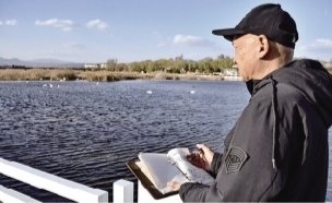 密云水库管理处库区管理所水环境巡查三组组长王全民在观测登记候鸟活动情况。