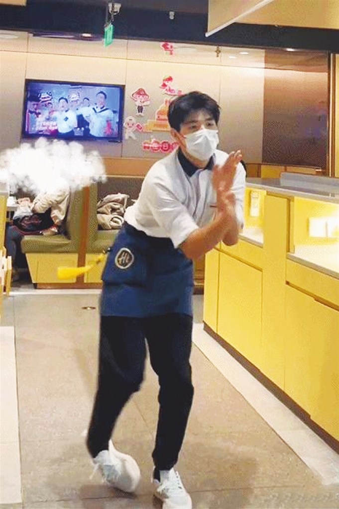 在部分海底捞门店,只需要对服务员说“我要科目三”,就会有靓仔、靓女服务员为你来上一段魔性的舞蹈:摇花手、扭腰、摆胯,配合节奏鲜明的音乐,很符合现在年轻人的精神状态。
