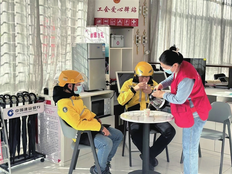 11月25日上午,和泽苑社区党群服务中心爱心驿站内,几名外卖骑手忙完早高峰送餐后,在此短暂休息。最近气温降低,来驿站的户外劳动者明显增多。为此,该社区在驿站加派人手,比平时“早1个小时开门,晚1个小时关门”,为有需要的群体提供更优质的服务。