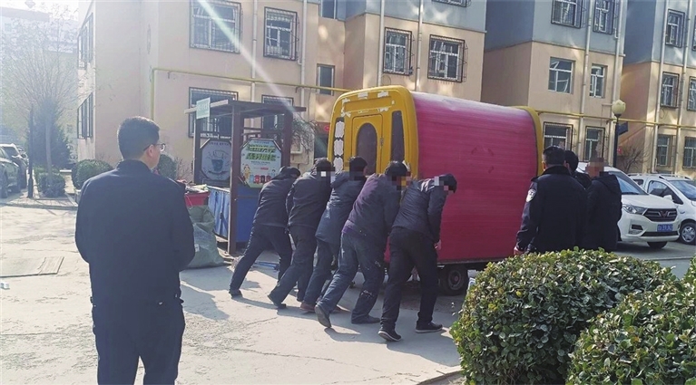 经了解,这对夫妻曾用四轮推车经营小吃摊,其后将废旧不用的推车停放在小区公共停车位,并卸掉轮胎用来当存放塑料瓶、纸片的小仓库,长期占用停车位,给群众的日常出行造成诸多不便,居民反映强烈。其间,小区居民和物业、社区工作人员多次与这对夫妻协商,但均未起到实质性效果。