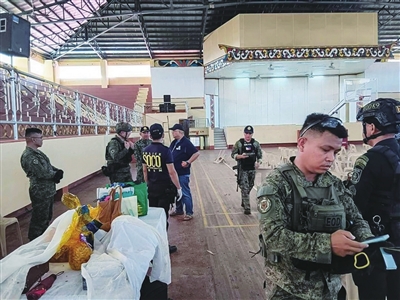 12月3日,在菲律宾南拉瑙省马拉维市棉兰老岛国立大学,警方人员与军人调查爆炸现场。