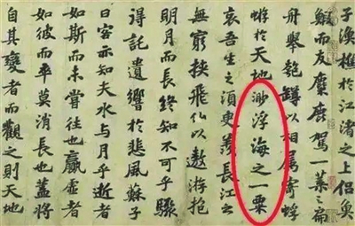 如今台北故宫博物院展出苏轼《前赤壁赋》,可见原文写着“寄蜉蝣于天地,渺浮海之一粟”,并非是沧海一粟。至于为何会出现这样的错误,有研究学者曾推测,可能是“沧”和“浮”字形相近,加上真迹只有少数人能看到,才会在传抄或出版印刷过程中误植。