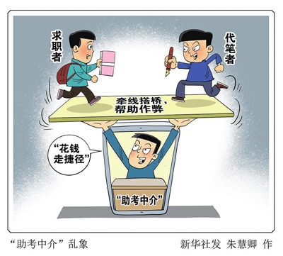 业内人士介绍,一些“助考中介”在考生与代笔者之间牵线搭桥,利用各种手段帮助考生作弊得高分。