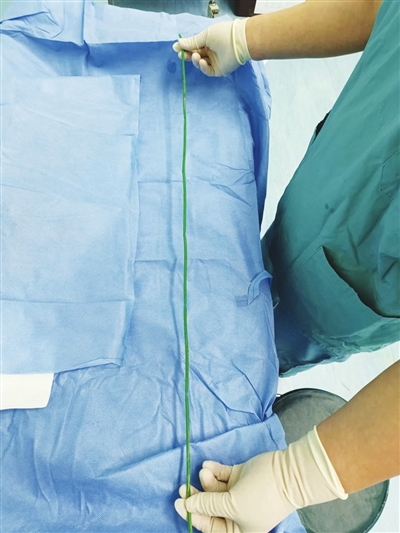 在门诊完成了影像学检查,医生发现王先生膀胱内及后尿道可见迂曲管状异物,可以确定输液管在体内的基本位置。经过科内充分讨论分析,泌尿外科医护团队制订了详细的手术方案。在胡佩胜主任的指导协助下,陈晓鹏医师为患者施行了“经尿道膀胱异物取出术”,成功将膀胱内长约1米的异物取出,目前王先生恢复良好。