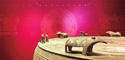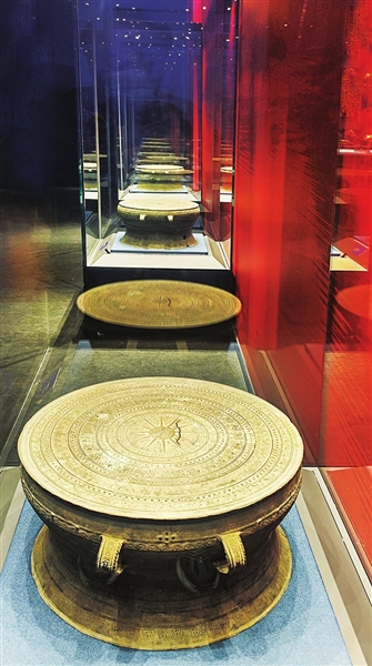 展厅中的壮族铜鼓,精巧别致,直勾起观者击打的欲望。看着这稻作文化的产物,人们仿佛听到了激越的鼓声、清脆的铜音,好似八桂大地为并州人民送来的喜庆祝福……