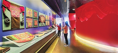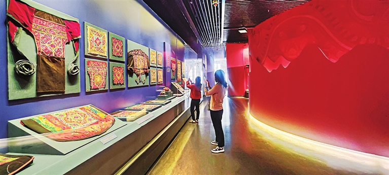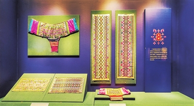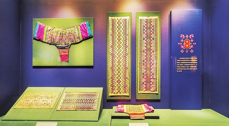 刺绣传情 广西各民族刺绣具万物之有状,尽众化之为形,是民族文化的符号,是人民智慧的结晶。刺绣工艺细腻,针法多变,具体可分为挑绣、平绣、剪纸绣和补花绣等。展品色彩艳丽,匠心独具,动人心目。