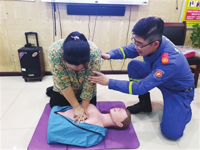 活动中,蓝天救援队张鹏教官首先对掌握防震知识的意义和重要性作阐述,接着对地震正确逃生方法、家庭防震准备等知识一一进行讲解,帮助社区工作人员和居民们了解并掌握避灾的基本技能。图文结合地讲述“躲、开、关、逃”四字诀,让防震减灾意识植入每个人心中。过程中,张教官还向居民们介绍了烧、烫伤的应对方法,用“冲、脱、泡、盖、送”的简单口诀,引导居民实施正确的自救及他救方法。最后,通过对“模拟人”实施心脏复苏抢救,为大家演示如何判断被救人是否丧失意识、有无自主呼吸等要点,让大家明白急救的每个步骤及其重要性。