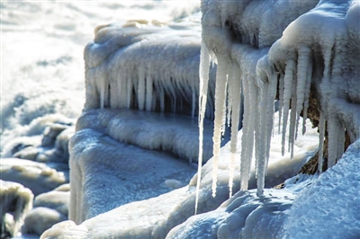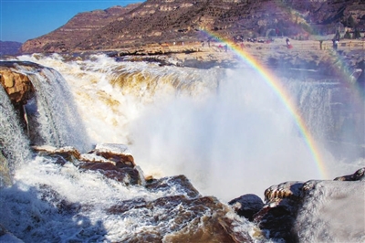 近日,受降温天气影响,位于秦晋峡谷中段的黄河壶口瀑布出现冬季冰挂美景,冰挂在阳光的照射下层层叠叠,晶莹剔透,彩虹也为冬日的壶口瀑布添上了美丽的色彩。图为黄河壶口瀑布现冬季冰挂彩虹美景。
