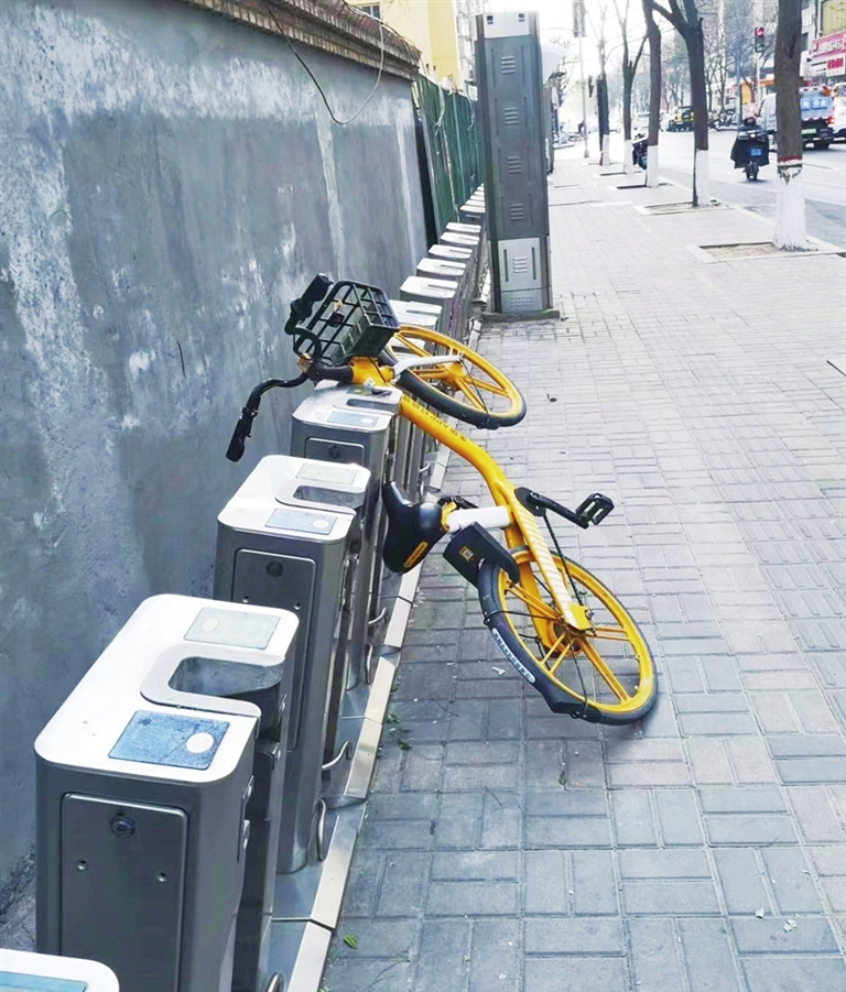 拍摄经过:12月10日,我途经亲贤西街与寇庄西路交叉口东北角时,看到一辆共享单车被人扔在公共自行车租赁点锁桩之间的夹缝内。这种不文明行为给共享单车和锁桩造成损坏,影响城市形象,希望广大市民共同监督,及时制止。
