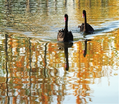 突然,发现湖面上那对闻名植物园的黑天鹅,缓缓向着我们游来。在这个看似平常的画面中,忽然,一个元素激发了我的灵感:一大片金黄的林木,将倒影洒落在湖面上。出现了一个美丽的画面。瞬间,一个作品的名称跳了出来:游秋。就是它。一个没未有过的画面感出现了。当这对恩爱的黑天鹅,畅游在洒满落金的湖面上恰当的位置时,带来的拍摄冲动出现了。金色的秋天在哪里?在静静的湖面上,在快乐的天鹅戏水的画面中。《游秋》既诗意又写实般的定格成了一幅瞬间消失的难得的摄影作品。