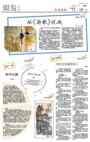 和平公园的整体轮廓犹如一条朝向东南方向的鱼,而景观核心区域就是位于“鱼肚”部位的中心湖泊。《西江月》是一首小令,词的开篇就从“曲水逶迤画影”入笔,“群花烂漫藤枝”着色。紧接着“林纡山地共云栖,若隐亭轩取次。”意境清雅,可谓一步一景,层层递进。上片状景,下片写人,是常用的词法之一,本词的下片即是以写人为主。过道上熙熙人迹,堤岸边袅袅弦音,尤其尾句:“彩屏笑对小儿姿,打鼓石前舞戏。”活脱出小孩子在节日广场打鼓石前嬉戏,模仿打鼓石雕姿态,有情有趣且接地气。