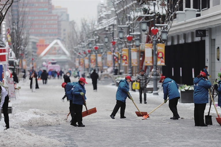 12月11日上午,钟楼街步行街环卫工人们正在加紧有序清扫积雪,确保市民出行安全。 张昊宇 摄