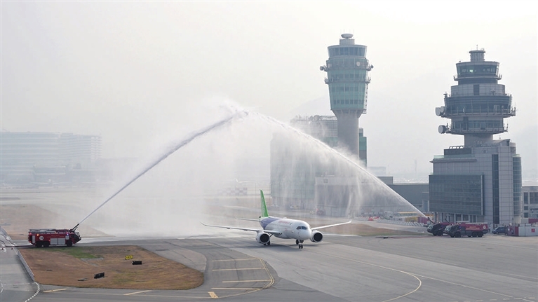 当天13时58分,ARJ21飞机先行在香港国际机场南跑道降落,C919飞机两分钟后降落。两架飞机落地时,机场举行航空界的最高礼仪“水门礼”迎接,由两辆消防车分列左右两旁,喷射出“半圆形水柱”,两架飞机从水柱下穿过。