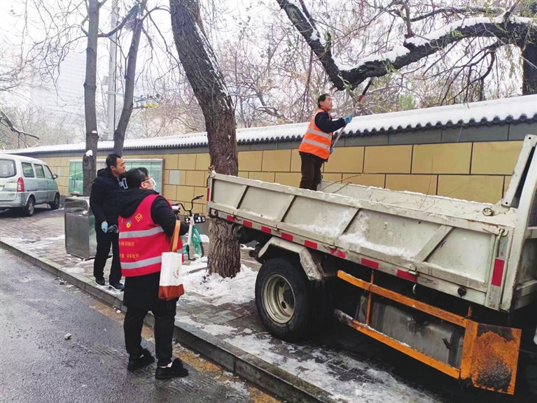 12月12日上午,园林工人赶赴现场,对树木进行修剪。1个多小时后,严重变形的大树被成功修剪,铁丝也被固定到更加牢靠的地方。当郭慧把掉落的树枝全部清理干净后,在场的居民直夸她为大家办了件好事。