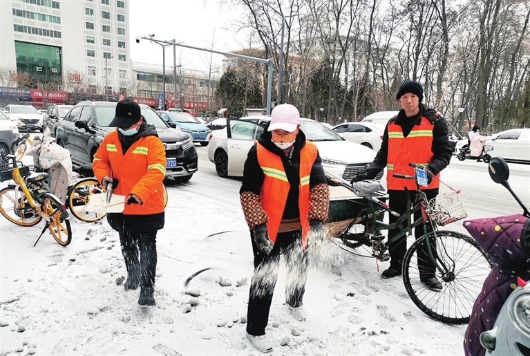 昨日上午10时许,随着降雪越来越大,地面逐渐变白,市环卫中心机械清洁部出动大型融雪剂撒布车,首先在城市主干道开展作业。针对前场降雪形成的路面结冰,环卫部门出动滚刷清雪车作业,最大程度消除路面冰雪,保障车辆行驶安全。