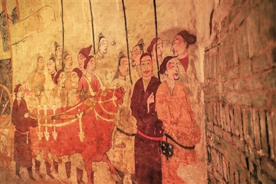 徐显秀墓中发现国内保存最完好的北齐时代壁画,总面积330余平方米。壁画中有各类人物200多个,包含夫妇宴飨行乐、车马仪仗和牛车出行等宏大场面,艳丽壮观,极为精彩。壁画布局和谐,将内容纷繁、人物关系复杂的画面,整合得浑然一体,堪称北朝墓葬壁画艺术的鸿篇巨制。