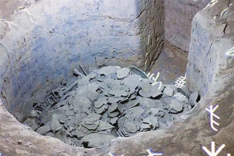 这件牛胛骨版记事刻辞和其他卜辞一起作为档案资料被埋藏在洹河岸边的黄土里。