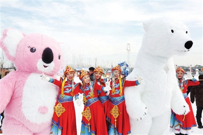 放眼望去,稻田公园雪场银装素裹,雪山、雪道、冰挂长廊应有尽有,寒冷又静谧,仿佛置身北国极寒之地。纯白的雪毯绵延伸展开来,高低起伏,美得摄人心魄。正对冰雪世界大门,是一群憨态可掬的企鹅雕像,“企鹅”身后是一座蜿蜒的雪山,几只“北极熊”站在山顶,白色身影在蓝天白云的映衬下,让游客瞬间感觉仿佛来到北极冰川。雪山脚下不远处,坐落着三个蒙古包,游客可在这里穿上蒙古服饰,或拍一组蒙古风情十足的美照,或在这里品尝蒙古特色奶茶,欣赏蒙古民族表演。