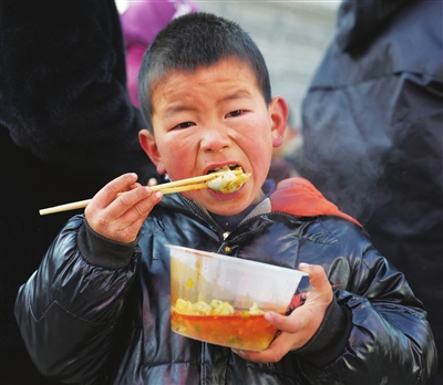 在民和县中川乡美一小学,500多名受灾群众已经住进了帐篷中,他们大多来自受灾严重的草滩村。22日13时,记者看到他们已经吃上了热气腾腾的饺子。