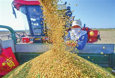 10月14日,在河南省洛阳市孟津区会盟镇黄河岸边的下古村,农民收获大豆。今年,我国继续提高小麦、稻谷最低收购价,完善玉米大豆生产者补贴,增加产粮大县奖励资金规模,扩大三大粮食作物完全成本保险和种植收入保险实施范围。