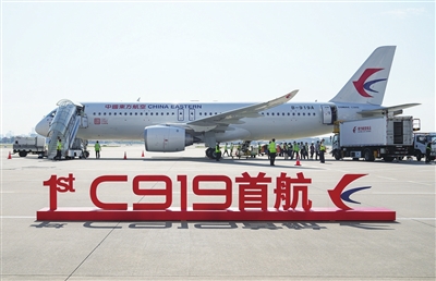 5月28日在上海虹桥国际机场停机坪拍摄的C919飞机。当日,由C919大型客机执飞的东方航空MU9191航班平稳降落在北京首都国际机场,标志着该机型圆满完成首个商业航班飞行,正式进入民航市场,开启市场化运营、产业化发展新征程。