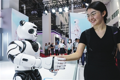8月16日,一名女士在北京举办的2023世界机器人大会现场与智能机器人握手。