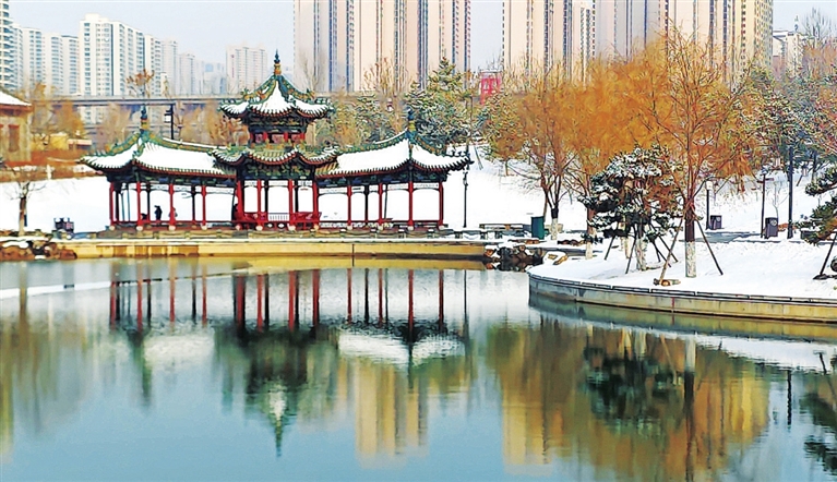 另一幅是近日雪后来到双塔公园拍摄的作品《双塔雪霁》。雪后,天空略见放晴,来到公园寻找拍摄题材。巡视过后,发现湖水古亭建筑倒映在尚未结冰的湖水中,静如平镜的效果下,形成了近乎对称似的效果。加上岸上曲线变化,带来了画面美丽的动感效果。白雪、建筑的色彩和稍发红的树枝以及古建背后正在兴起的现代楼群,形成了一幅优雅、宁静而又有生活气息的画面。一场雪后造就了一幅美丽画卷,这就是摄影的表现魅力所在。