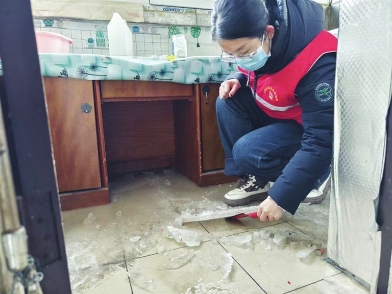 网格员找来工具,一点点清除尚未融化的冰,并用墩布擦干地板。随即,维修人员上门,修好了管道,彻底解决了漏水问题。临走,网格员关上了窗户,并打电话叮嘱房主,即便不住,也要关窗,否则夜晚会冻住水管。
