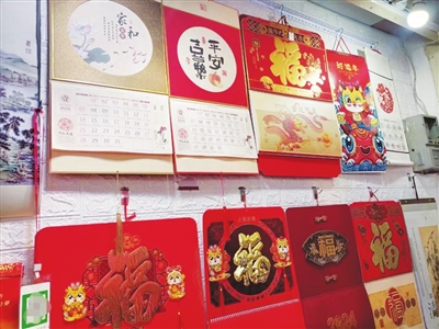 在康隆商城、小商品批发市场,均有挂历在售。记者观察发现,由于买的人少了,挂历都是与春联、福字等合用一个摊位。品类上多为风景、书画、花卉、福字系列。