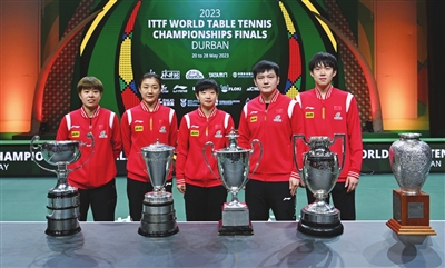 5月20日至28日,世界乒乓球锦标赛在南非德班举行,中国队包揽五个单项冠军,樊振东、孙颖莎分别摘得男、女单打金牌,樊振东/王楚钦为中国队时隔四年重夺男双冠军,陈梦/王艺迪女双登顶,王楚钦/孙颖莎混双卫冕。