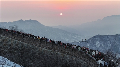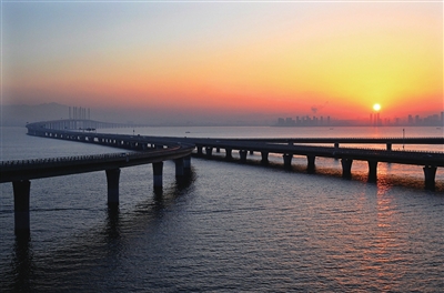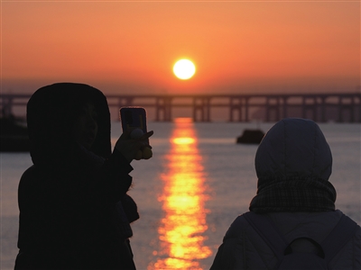 这是1月1日在山东青岛胶州湾跨海大桥拍摄的日出。