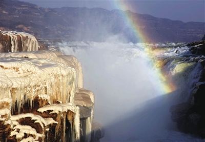 1月2日,位于山西吉县和陕西宜川县交界的黄河壶口瀑布出现“冰瀑飞虹”景观。