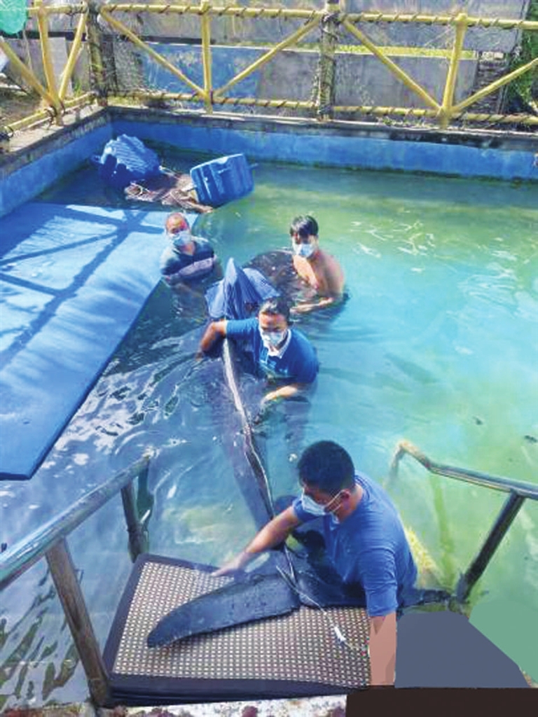 据三亚海昌生物保育中心工作人员介绍,目前,鲸鱼仍无法独立自主游泳,救援人员将以3人至4人为一组,在水中托扶,防止鲸鱼侧翻呛水。三亚海昌生物保育中心兽医已对搁浅鲸鱼进行抽血化验,正等待检验结果。