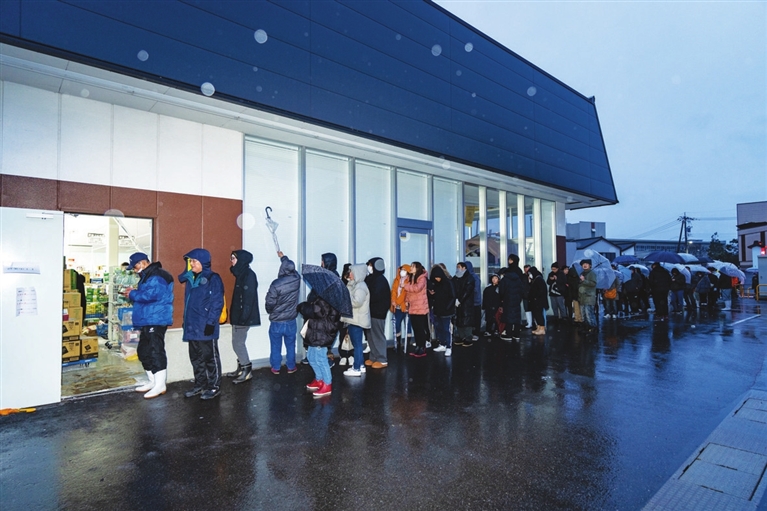 路旁,居民在雨中撑伞排起长队。队伍中一名20来岁的女孩告诉记者,这里是整个轮岛市灾后唯一营业的超市,她在社交媒体上看到超市开始营业的消息,就和家人走了半个多小时来到这里购物。目前已经排队3个多小时,什么时候能排到,排到之后还有没有食品仍未知。