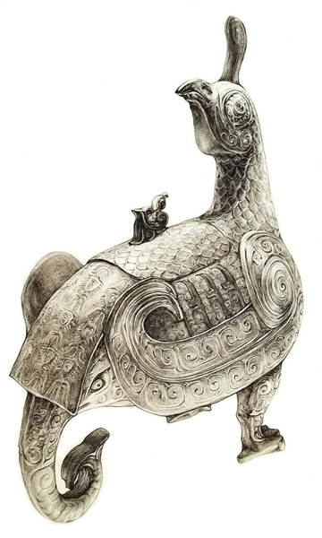 河汾之东,我在这里降生。制模,制范,浇注,去范,修整,我在匠人手中范铸而成。我是周人崇敬的凤鸟,高冠耸立,凤眼圆睁,回眸而视背部的雏鸟。我双翼上卷,前胸饱满,扇形的齐短尾微微翘起,双爪紧紧扣地,身上饰满云纹、雷纹、羽片纹、立羽纹、羽翎纹,繁而不乱。一只长鼻内卷的象充当了我的尾部,与我硕壮的双腿,稳稳支撑起我卓然的身躯。吉祥的金色,昭示着我的尊贵与高雅。