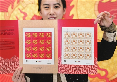 1月5日,一名顾客在现场展示自己刚刚购买的《甲辰年》特种邮票。