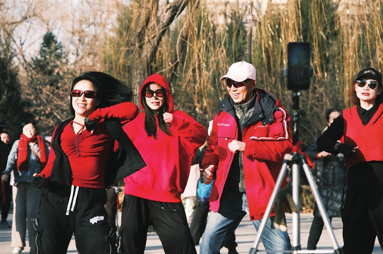 1月5日,市民在龙潭公园直播跳舞,展现了太原人的精气神和丰富的业余生活。王韵菲 摄