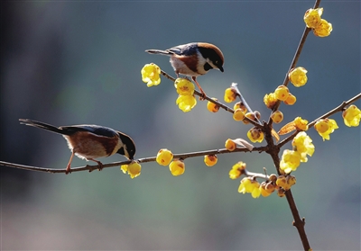 1月6日,在江苏无锡梅园,小鸟在腊梅枝头嬉戏。