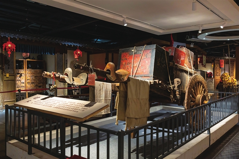 晋商纵横商界500年,横跨欧亚,足迹远至俄国、朝鲜、日本等地。博物馆内展示的晋商运货的镖车,长390厘米、宽155厘米、高145厘米。榆木车架,以铁加固,箱体底为木架,左右挡板,木制辐条,轮牙用铆钉加固。细致打量这辆镖车,仿佛能听到晋商开创万里茶道的声声驼铃。镖车旁边有一张庙椅,其多见于晋中南及晋西北与陕西交界一带,地域特色鲜明,该展品形制古老,椅身修长,腿足下部多雕刻,线条行云流水,造型简洁素雅。