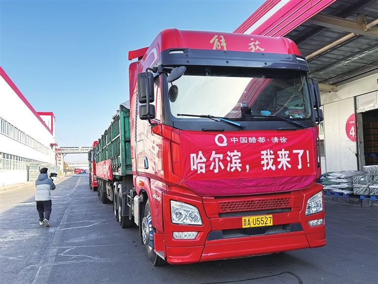 14日上午,在清徐县水塔醋业集团生产园区,由紫林、水塔、美锦、东湖四大知名醋企提供的各种醋礼已经全部装车。几位身着红色工服的员工,将一箱箱老陈醋、醋饮、醋小吃整齐摆放,完成扫尾工作。车身上的“哈尔滨,我来了”“我准备好了,要去哈尔滨领略北国风光!”等红色条幅格外醒目。