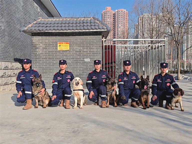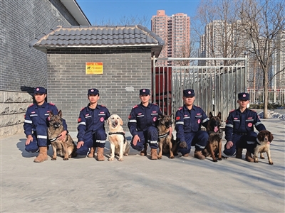 搜救犬班班长郭强一一介绍5只搜救犬。“这只拉布拉多名叫‘天狼’,它和‘狼牙’是2019年最早入队的搜救犬。‘狼牙’是马里努阿犬,反应敏捷、性格活泼,弹跳爆发力尤其强,最受大家喜爱!”