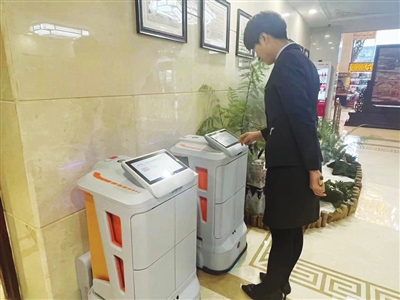 同时,还有灰白色的送物机器人,客人按照相关提示,将物品放入并锁上。机器人即会将物品送至具体客房,还会自主上下电梯。