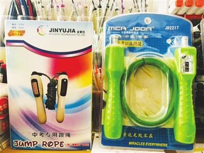“中考跳绳和普通跳绳的区别我也不懂,反正中学要求用这种,我们就去批发这种。一根零售价110元(带计数功能)。”多名店主坦露,价格这么贵,只有中学生才买,他们也不敢多批发,多了怕卖不掉。