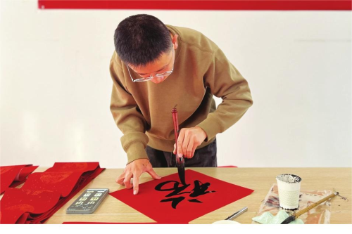 这段时间,在江阳社区活动中心,总能看到一个小伙子,用左手在案头挥毫泼墨,笔走龙蛇。凡是有居民来要春联和福字的,他都详细和对方沟通,了解清楚居民想要的对联内容、字迹类型、设计版式等,然后现场创作免费赠送。由于他的创作水平高,连日来慕名而来的人络绎不绝。