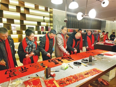 近日,万柏林区委统战部、区工商联、区侨联共同举办“统战挥毫抒壮志 柏林献福迎新春”文化交流活动。统战系统机关干部、各民主党派、优秀民营企业家、归侨侨眷及省城书画名家,共计100余人参加活动。大家集体书写百米长卷,同心共绘中国福,充分展示了该区统战工作“想在一起、干在一起”的精神风貌。 侯慧琴 郭瑶 摄