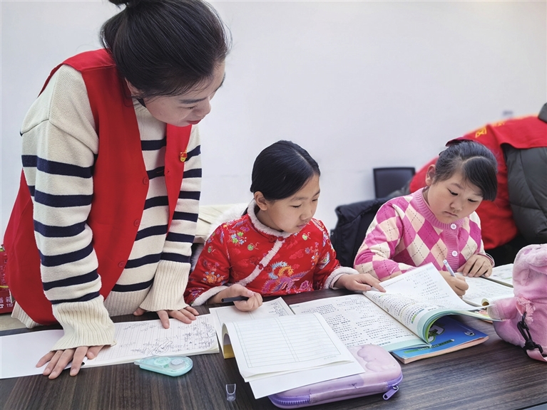 “老师,您帮我看看这道题怎么解?”“老师,这个单词怎么读?”在社区“教室”里,孩子们认真书写寒假作业。遇到难题,大学生志愿者会耐心地与孩子共同探讨,找到解题思路。同时,还帮助检查作业,并及时纠错。